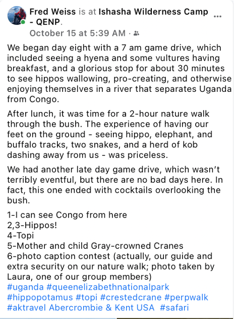 Uganda 2021 – Day Eight Posted byFred WeissOctober 26, 2021February 3, 2022Posted inUganda (Gorilla & Chimpanzee Trek) - Oct 2021Tags:africansafari, africanwildlife, aktravel, eastafricasafari, gamedrive, graycrownedcrane, hippo, ishashawildernesscamp, queenelisabethnationalpark, safari, topi, uganda Share this: Click to share on X (Opens in new window) X Click to share on Facebook (Opens in new window) Facebook Click to share on Threads (Opens in new window) Threads Click to share on Bluesky (Opens in new window) Bluesky Like Loading... Related Published by Fred Weiss 7 continents/64 countries & territories/49 states. Family history. Film/vintage film posters. Dead Head. Baseball. Sometimes I take pictures. View more posts