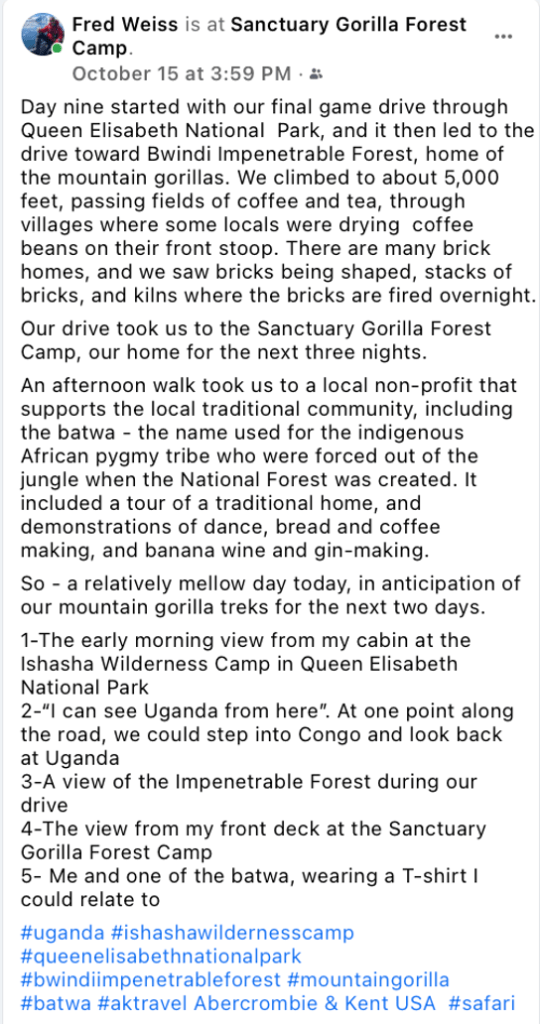 Uganda 2021 – Day Nine Posted byFred WeissOctober 26, 2021February 3, 2022Posted inUganda (Gorilla & Chimpanzee Trek) - Oct 2021Tags:africansafari, africanwildlife, aktravel, batwa, bwindi, bwindiimpenetrableforest, eastafricasafari, gamedrive, ishashawildernesscamp, mountaingorilla, queenelisabethnationalpark, safari, sanctuarygorillaforestcamp, uganda Share this: Click to share on X (Opens in new window) X Click to share on Facebook (Opens in new window) Facebook Click to share on Threads (Opens in new window) Threads Click to share on Bluesky (Opens in new window) Bluesky Like Loading... Related Published by Fred Weiss 7 continents/64 countries & territories/49 states. Family history. Film/vintage film posters. Dead Head. Baseball. Sometimes I take pictures. View more posts