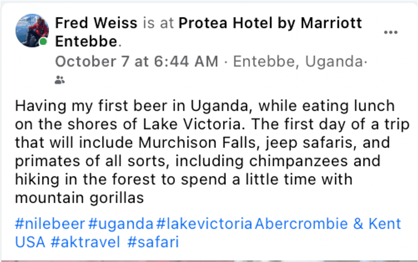 Uganda 2021 – Day One Posted byFred WeissOctober 26, 2021February 3, 2022Posted inUganda (Gorilla & Chimpanzee Trek) - Oct 2021Tags:africansafari, africanwildlife, aktravel, eastafricasafari, gamedrive, lakevictoria, nilebeer, safari, uganda Share this: Click to share on X (Opens in new window) X Click to share on Facebook (Opens in new window) Facebook Click to share on Threads (Opens in new window) Threads Click to share on Bluesky (Opens in new window) Bluesky Like Loading... Related Published by Fred Weiss 7 continents/64 countries & territories/49 states. Family history. Film/vintage film posters. Dead Head. Baseball. Sometimes I take pictures. View more posts