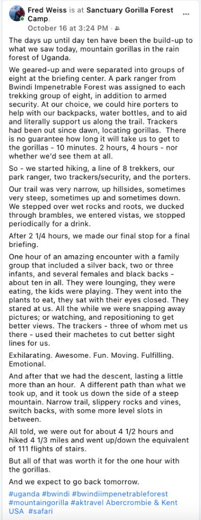 Uganda 2021 – Day Ten Posted byFred WeissOctober 26, 2021February 3, 2022Posted inUganda (Gorilla & Chimpanzee Trek) - Oct 2021Tags:africansafari, africanwildlife, aktravel, bwindi, bwindiimpenetrableforest, eastafricasafari, gamedrive, mountaingorilla, safari, sanctuarygorillaforestcamp, uganda Share this: Click to share on X (Opens in new window) X Click to share on Facebook (Opens in new window) Facebook Click to share on Threads (Opens in new window) Threads Click to share on Bluesky (Opens in new window) Bluesky Like Loading... Related Published by Fred Weiss 7 continents/64 countries & territories/49 states. Family history. Film/vintage film posters. Dead Head. Baseball. Sometimes I take pictures. View more posts