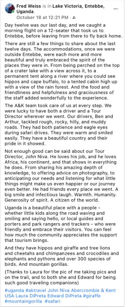 Uganda 2021 – Day Twelve Posted byFred WeissOctober 26, 2021February 3, 2022Posted inUganda (Gorilla & Chimpanzee Trek) - Oct 2021Tags:africansafari, africanwildlife, aktravel, eastafricasafari, gamedrive, giraffe, safari, uganda Share this: Click to share on X (Opens in new window) X Click to share on Facebook (Opens in new window) Facebook Click to share on Threads (Opens in new window) Threads Click to share on Bluesky (Opens in new window) Bluesky Like Loading... Related Published by Fred Weiss 7 continents/64 countries & territories/49 states. Family history. Film/vintage film posters. Dead Head. Baseball. Sometimes I take pictures. View more posts