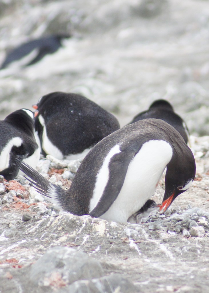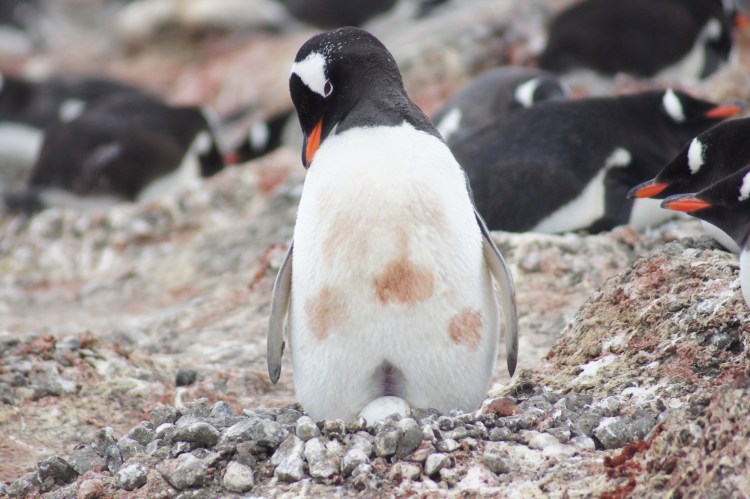 The first two dudes are the appropriately named Chinstrap penguins. They peacefully co-exist with the two other breeds we saw – Gentoos and Adelies. In the second photo, you can see the egg below this Gentoo, who also is stained by who knows what. They’re pretty fascinating to just sit and watch and watch and watch. Pretty clumsy on land, they’re amazing swimmers. If you look closely at the third photo you can see a chick underneath the Gentoo.