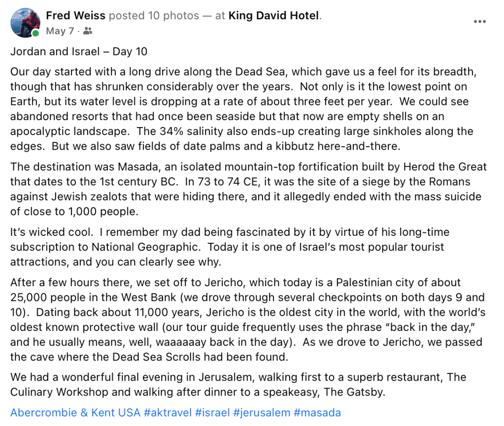 Jordan & Israel – Day Ten Posted byFred WeissAugust 29, 2022August 4, 2023Posted inJordan and Israel - April/May 2022Tags:Abercrombie&Kent, aktravel, AncientWonders, HolyLand, Israel, Jericho, Jordan, Masada Share this: Click to share on X (Opens in new window) X Click to share on Facebook (Opens in new window) Facebook Click to share on Threads (Opens in new window) Threads Click to share on Bluesky (Opens in new window) Bluesky Like Loading... Related Published by Fred Weiss 7 continents/64 countries & territories/49 states. Family history. Film/vintage film posters. Dead Head. Baseball. Sometimes I take pictures. View more posts