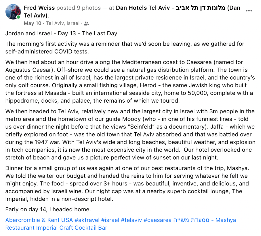 Jordan & Israel – Day Thirteen Posted byFred WeissSeptember 3, 2022Posted inJordan and Israel - April/May 2022Tags:Abercrombie&Kent, aktravel, AncientWonders, Caesarea, HolyLand, Israel, Jordan, TelAviv Share this: Click to share on X (Opens in new window) X Click to share on Facebook (Opens in new window) Facebook Click to share on Threads (Opens in new window) Threads Click to share on Bluesky (Opens in new window) Bluesky Like Loading... Related Published by Fred Weiss 7 continents/64 countries & territories/49 states. Family history. Film/vintage film posters. Dead Head. Baseball. Sometimes I take pictures. View more posts
