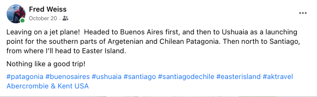 Patagonia/Rapa Nui – Day One Posted byFred WeissDecember 28, 2022Posted inPatagonia/Rapa Nui (Easter Island) - Oct 2022Tags:Abercrombie&Kent, Argentina, Buenos Aires, Chile, Patagonia, travel blog Share this: Click to share on X (Opens in new window) X Click to share on Facebook (Opens in new window) Facebook Click to share on Threads (Opens in new window) Threads Click to share on Bluesky (Opens in new window) Bluesky Like Loading... Related Published by Fred Weiss 7 continents/64 countries & territories/49 states. Family history. Film/vintage film posters. Dead Head. Baseball. Sometimes I take pictures. View more posts
