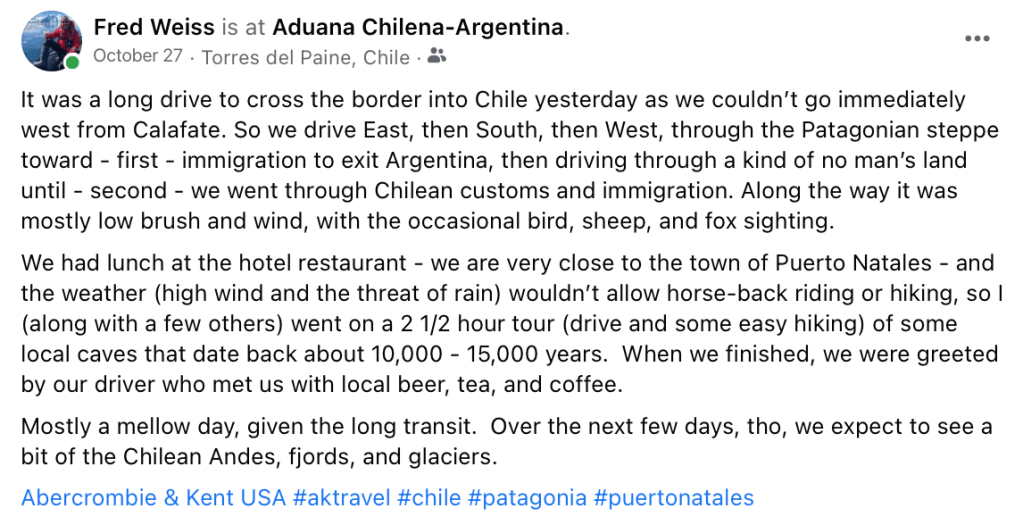 Patagonia/Rapa Nui – Day Six Posted byFred WeissJanuary 2, 2023December 29, 2022Posted inPatagonia/Rapa Nui (Easter Island) - Oct 2022Tags:#chile, #Patagonia, #puertonatales, #travel blog, Abercrombie&Kent, aktravel Share this: Click to share on X (Opens in new window) X Click to share on Facebook (Opens in new window) Facebook Click to share on Threads (Opens in new window) Threads Click to share on Bluesky (Opens in new window) Bluesky Like Loading... Related Published by Fred Weiss 7 continents/64 countries & territories/49 states. Family history. Film/vintage film posters. Dead Head. Baseball. Sometimes I take pictures. View more posts