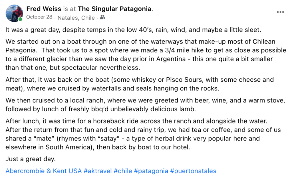 Patagonia/Rapa Nui – Day Seven Posted byFred WeissJanuary 3, 2023December 29, 2022Posted inPatagonia/Rapa Nui (Easter Island) - Oct 2022Tags:#chile, #Patagonia, #puertonatales, Abercrombie&Kent, aktravel, travel blog Share this: Click to share on X (Opens in new window) X Click to share on Facebook (Opens in new window) Facebook Click to share on Threads (Opens in new window) Threads Click to share on Bluesky (Opens in new window) Bluesky Like Loading... Related Published by Fred Weiss 7 continents/64 countries & territories/49 states. Family history. Film/vintage film posters. Dead Head. Baseball. Sometimes I take pictures. View more posts
