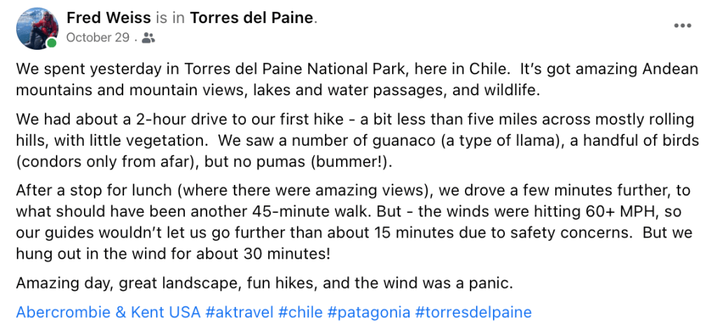 Patagonia/Rapa Nui – Day Eight Posted byFred WeissJanuary 4, 2023December 29, 2022Posted inPatagonia/Rapa Nui (Easter Island) - Oct 2022Tags:Abercrombie&Kent, aktravel, Chile, Patagonia, torresdelpaine, travel blog Share this: Share on X (Opens in new window) X Share on Facebook (Opens in new window) Facebook Share on Threads (Opens in new window) Threads Share on Bluesky (Opens in new window) Bluesky Like Loading... Related Published by Fred Weiss 7 continents/64 countries & territories/49 states. Family history. Film/vintage film posters. Dead Head. Baseball. Sometimes I take pictures. View more posts