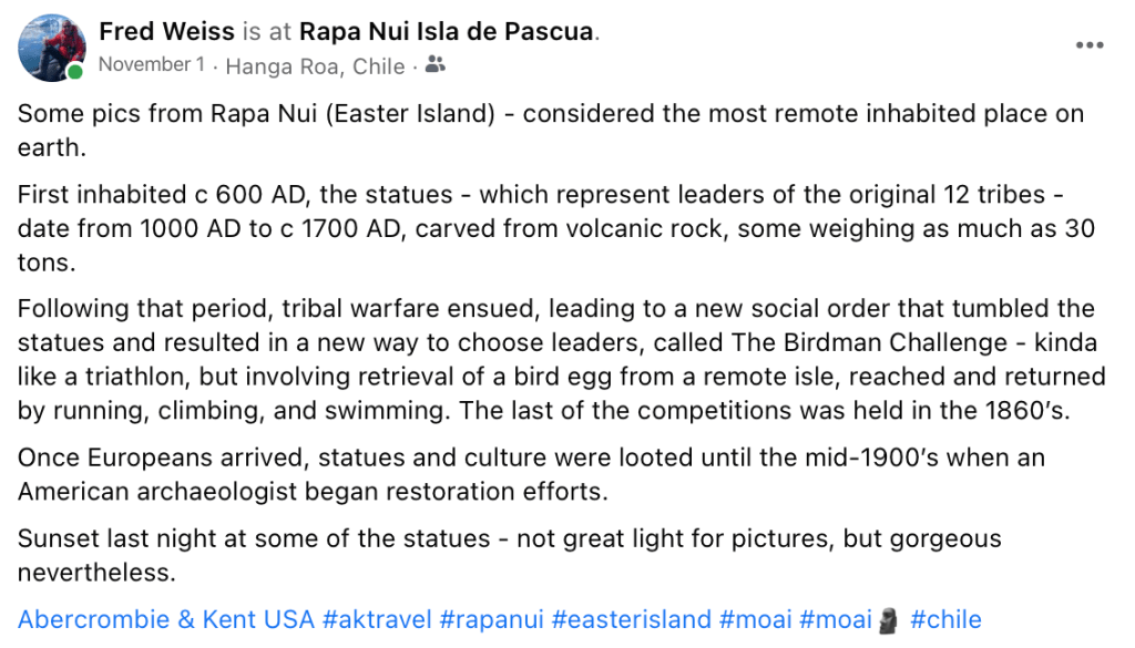 Patagonia/Rapa Nui – Day Eleven Posted byFred WeissJanuary 6, 2023December 29, 2022Posted inPatagonia/Rapa Nui (Easter Island) - Oct 2022Tags:Abercrombie&Kent, aktravel, Chile, Easter Island, Moai, Rapa Nui, travel blog Share this: Click to share on X (Opens in new window) X Click to share on Facebook (Opens in new window) Facebook Click to share on Threads (Opens in new window) Threads Click to share on Bluesky (Opens in new window) Bluesky Like Loading... Related Published by Fred Weiss 7 continents/64 countries & territories/49 states. Family history. Film/vintage film posters. Dead Head. Baseball. Sometimes I take pictures. View more posts