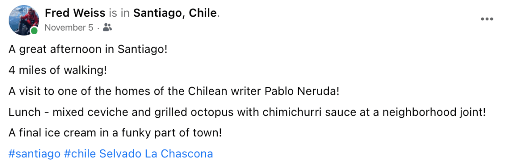 Patagonia/Rapa Nui – Day Fifteen Posted byFred WeissJanuary 11, 2023December 29, 2022Posted inPatagonia/Rapa Nui (Easter Island) - Oct 2022Tags:Abercrombie&Kent, aktravel, Chile, Santiago, Selvado La Chascona, travel blog Share this: Click to share on X (Opens in new window) X Click to share on Facebook (Opens in new window) Facebook Click to share on Threads (Opens in new window) Threads Click to share on Bluesky (Opens in new window) Bluesky Like Loading... Related Published by Fred Weiss 7 continents/64 countries & territories/49 states. Family history. Film/vintage film posters. Dead Head. Baseball. Sometimes I take pictures. View more posts