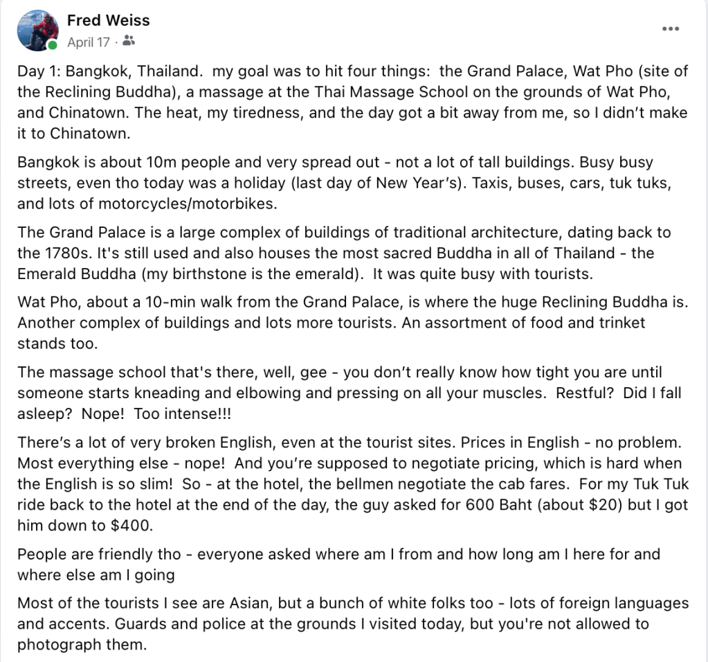 Bangkok, Bhutan, and Nepal – Day One Posted byFred WeissJuly 20, 2023July 19, 2023Posted inBangkok, Bhutan, & Nepal - April/May 2023Tags:Abercrombie&Kent, aktravel, Bangkok, Thailand, travel blog Riding a Tuk Tuk! Money offerings , . . beautifully blowing in the breeze The crowd outside the Emerald Buddha Share this: Click to share on X (Opens in new window) X Click to share on Facebook (Opens in new window) Facebook Click to share on Threads (Opens in new window) Threads Click to share on Bluesky (Opens in new window) Bluesky Like Loading... Related Published by Fred Weiss 7 continents/64 countries & territories/49 states. Family history. Film/vintage film posters. Dead Head. Baseball. Sometimes I take pictures. View more posts