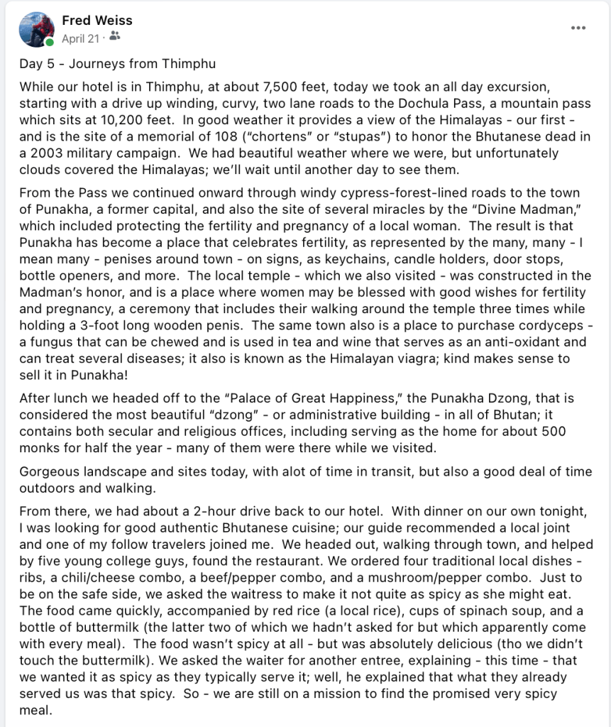 Bangkok, Bhutan, and Nepal – Day Five Posted byFred WeissJuly 24, 2023July 19, 2023Posted inBangkok, Bhutan, & Nepal - April/May 2023Tags:Abercrombie&Kent, aktravel, Bhutan, Punakha, PunakhaDzong, Thimphu, travel blog Share this: Click to share on X (Opens in new window) X Click to share on Facebook (Opens in new window) Facebook Click to share on Threads (Opens in new window) Threads Click to share on Bluesky (Opens in new window) Bluesky Like Loading... Related Published by Fred Weiss 7 continents/64 countries & territories/49 states. Family history. Film/vintage film posters. Dead Head. Baseball. Sometimes I take pictures. View more posts