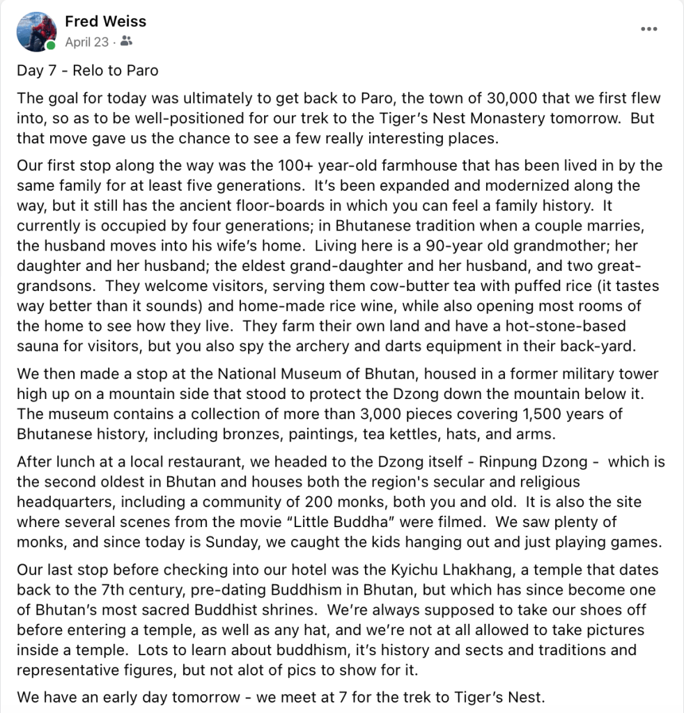 Bangkok, Bhutan, and Nepal – Day Seven Posted byFred WeissJuly 26, 2023July 19, 2023Posted inBangkok, Bhutan, & Nepal - April/May 2023Tags:Abercrombie&Kent, aktravel, Bhutan, Paro, travel blog Share this: Click to share on X (Opens in new window) X Click to share on Facebook (Opens in new window) Facebook Click to share on Threads (Opens in new window) Threads Click to share on Bluesky (Opens in new window) Bluesky Like Loading... Related Published by Fred Weiss 7 continents/64 countries & territories/49 states. Family history. Film/vintage film posters. Dead Head. Baseball. Sometimes I take pictures. View more posts