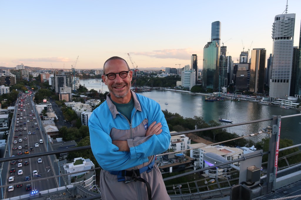 The highlight of the day, though, was a twilight climb to the top of the Story Bridge. This bridge, completed in 1940, spans the Brisbane River and is the longest cantilevered bridge in Australia. It stands about 245 feet high, and the climb (really a hike up steps high – like waaaayyyyy high – above the roadway) is made in small groups, everyone in matching jumpsuits, with harnesses wrapped around our waists and attached to cables lining the path. The only company that manages the climbs requires each customer to take a breathalyzer test before going and to empty their pockets and person of everything – wallets, phones, cameras, bracelets – pretty much everything except eyeglasses (which are then attached to the jumpsuits) and wedding bands. Other interesting facts: the climb itself is comprised of over 1,000 steps, and the bridge was built with about 1.25m rivets (yes, million). My climb went at twilight, which mean we got to see the sunlight and lights changing spectacularly over the city while taking in the amazing 360-degree views over the course of the two hours it took to complete it.