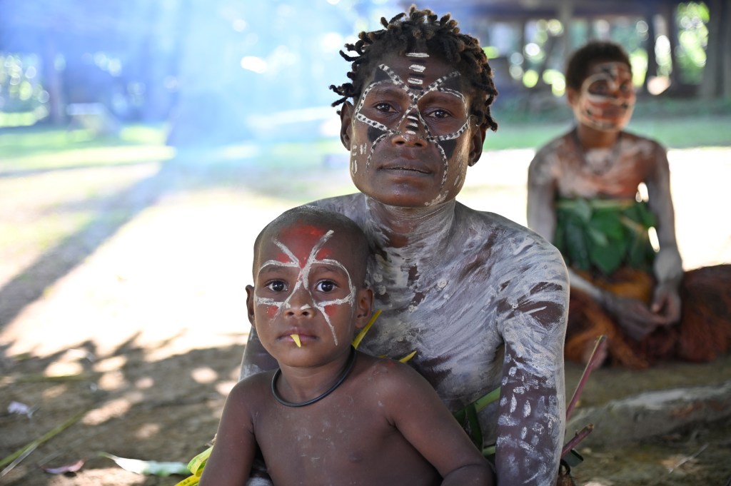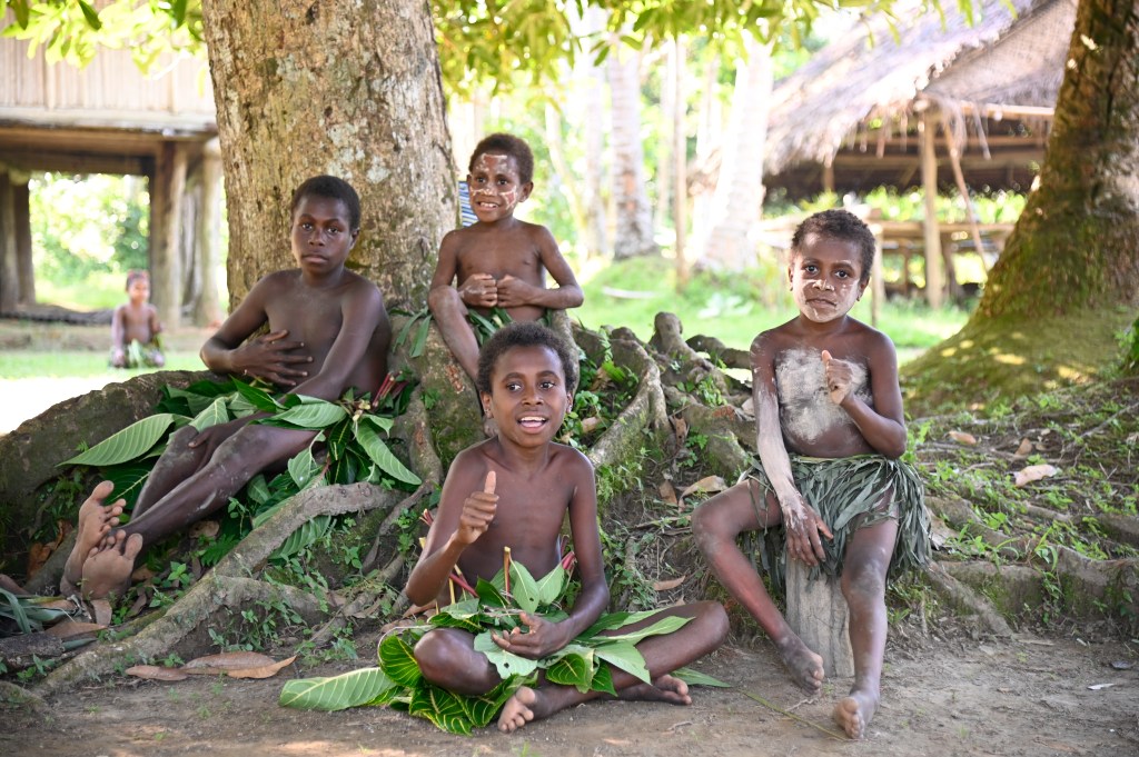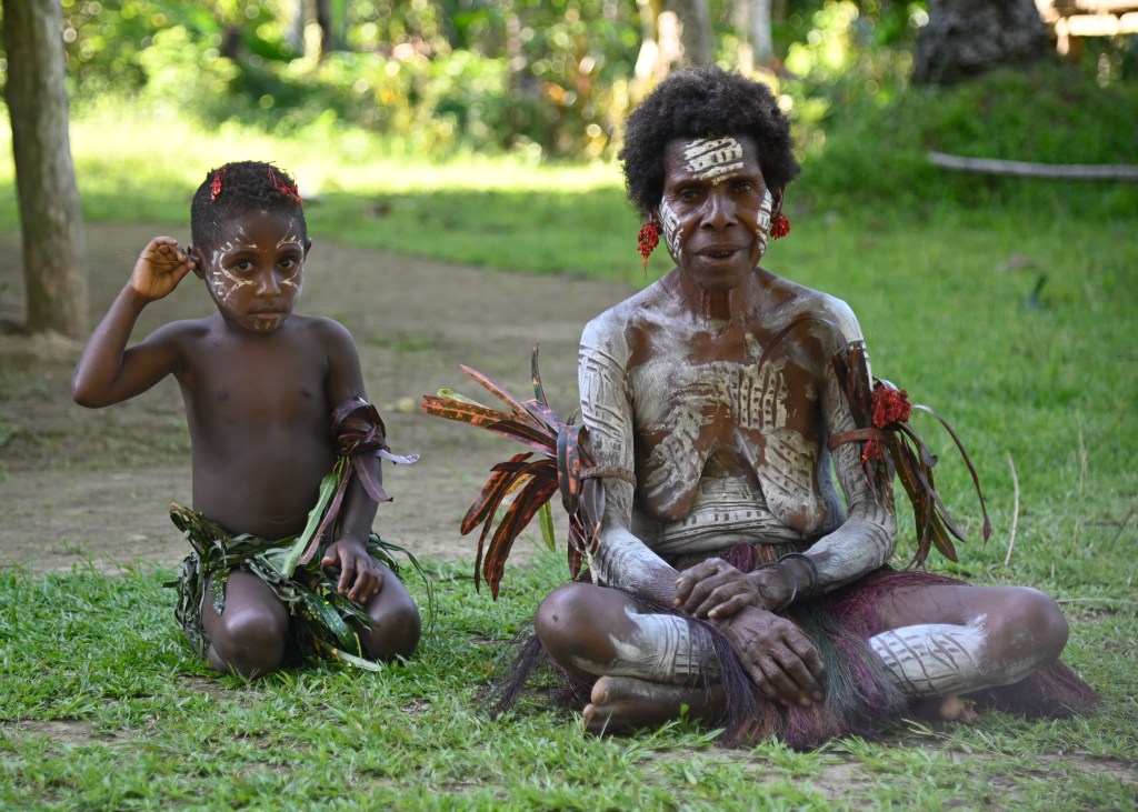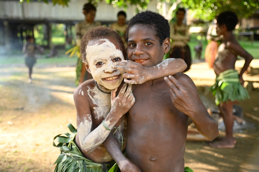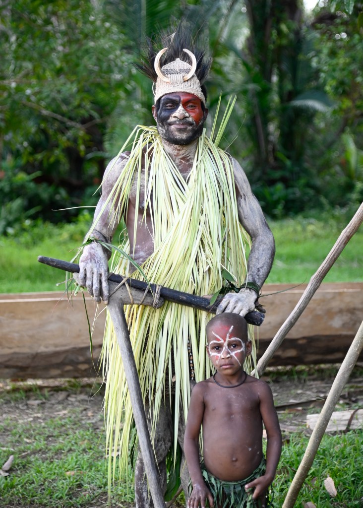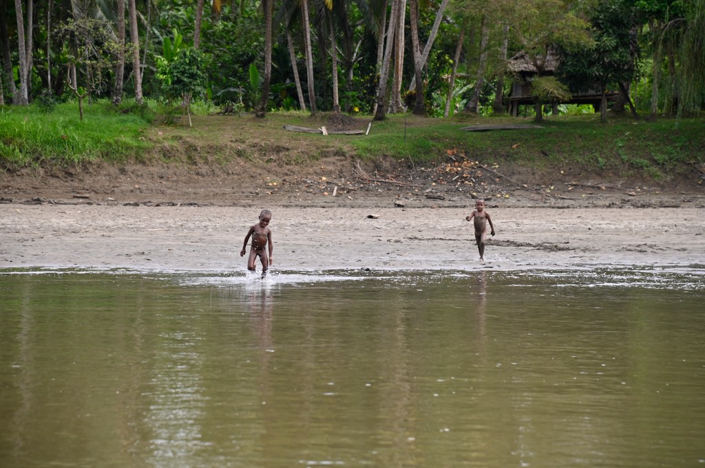 Our stop this afternoon was at a village known as Kundiman II. Here, men, women, and children showed us how important the sago palm – the “tree of life” – is to their existence. With all of the villagers dressed in mostly traditional clothing, head-ware, and face-painting, the men showed us how a palm is cut and broken up to get to the pulp; the women – some bare-breasted (which we would see continuously from Mount Hagen through this part of the journey) – showed us how the pulp was then softened into flour and then cooked into flat pancakes. Local vegetables were mixed with what they called “vegetarian piranha,” a type of fish – the pacu – that had been grilled or smoked.
