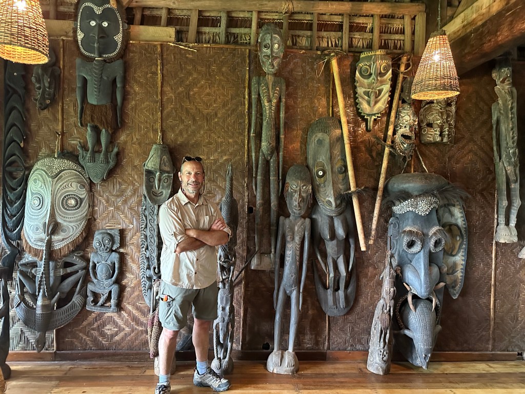 From the airport, located near the town of Amboin, whose terminal was a thatched-roofed wall-less hut where locals – including naked children – watched our arrival, we walked about 100 yards to the river’s edge, where we descended the muddy bank to a waiting 18-seat flat-bottom motorboat. This boat, later launched from more permanent housing, would be our means of exploring the river over the next four+ days. The boat took us on a 10-minute ride on this stretch of the river – about 50 yards wide and 10-20 feet deep, edged by jungle. This was a classic secluded jungle river – the Karawari – a major tributary of the mighty Sepik River, one of the longest in the world and the longest in Papua New Guinea. One of my travel mates was a Vietnam War veteran – a member of the Coast Guard who commanded a boat along the Mekong during the war. He told me our journeys over the next few days gave him many moments of reflection.