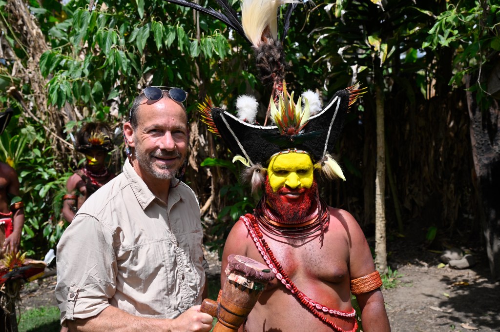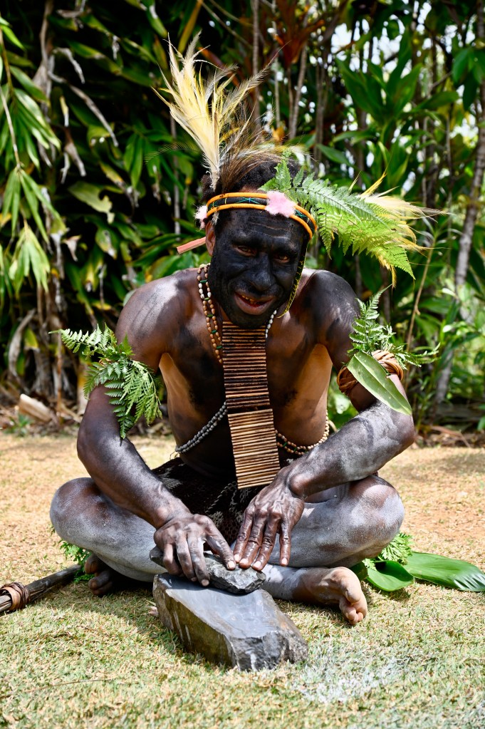 And, our last visit was with the well-known Goroka Mud Men, who make large masks (that cover their entire heads) out of clay, and who cover their bodies with clay as well. They showed us a scenario in which an unwanted visitor builds a fire in their territory and is then “attacked” by several mud men.