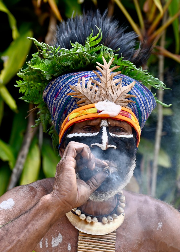 Our next visit was to see the Huli Wig Men, one of the better know tribes in the Highlands. They make hats – wigs – out of their own human hair and use those on top of their own hair. They have “everyday” wigs, wigs for special ceremonies (they wore those for us), and tribal leader wigs. As well, they decorate the wigs with feathers and other natural items, and pain their faces in vibrant colors. We saw them paint and dance.