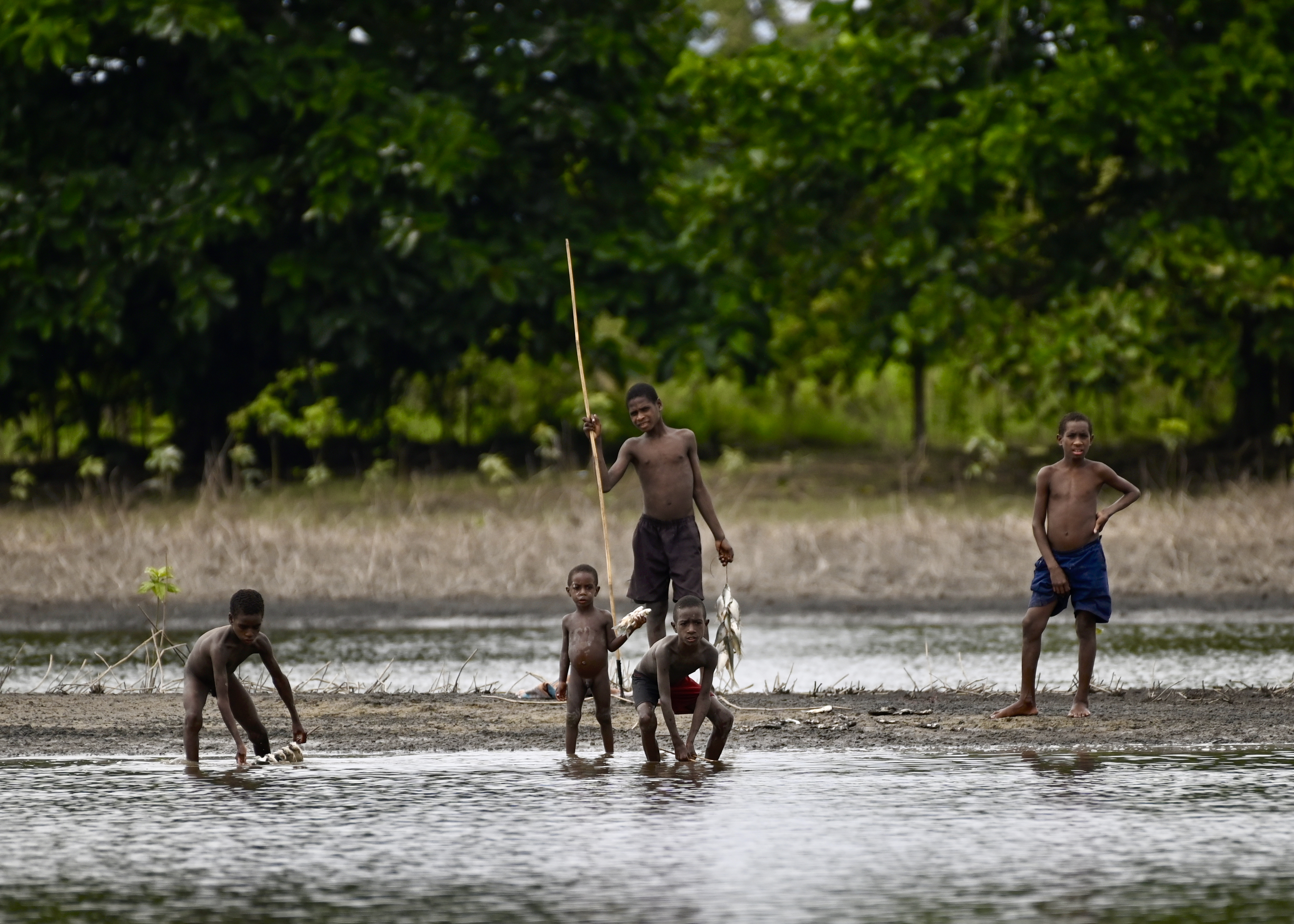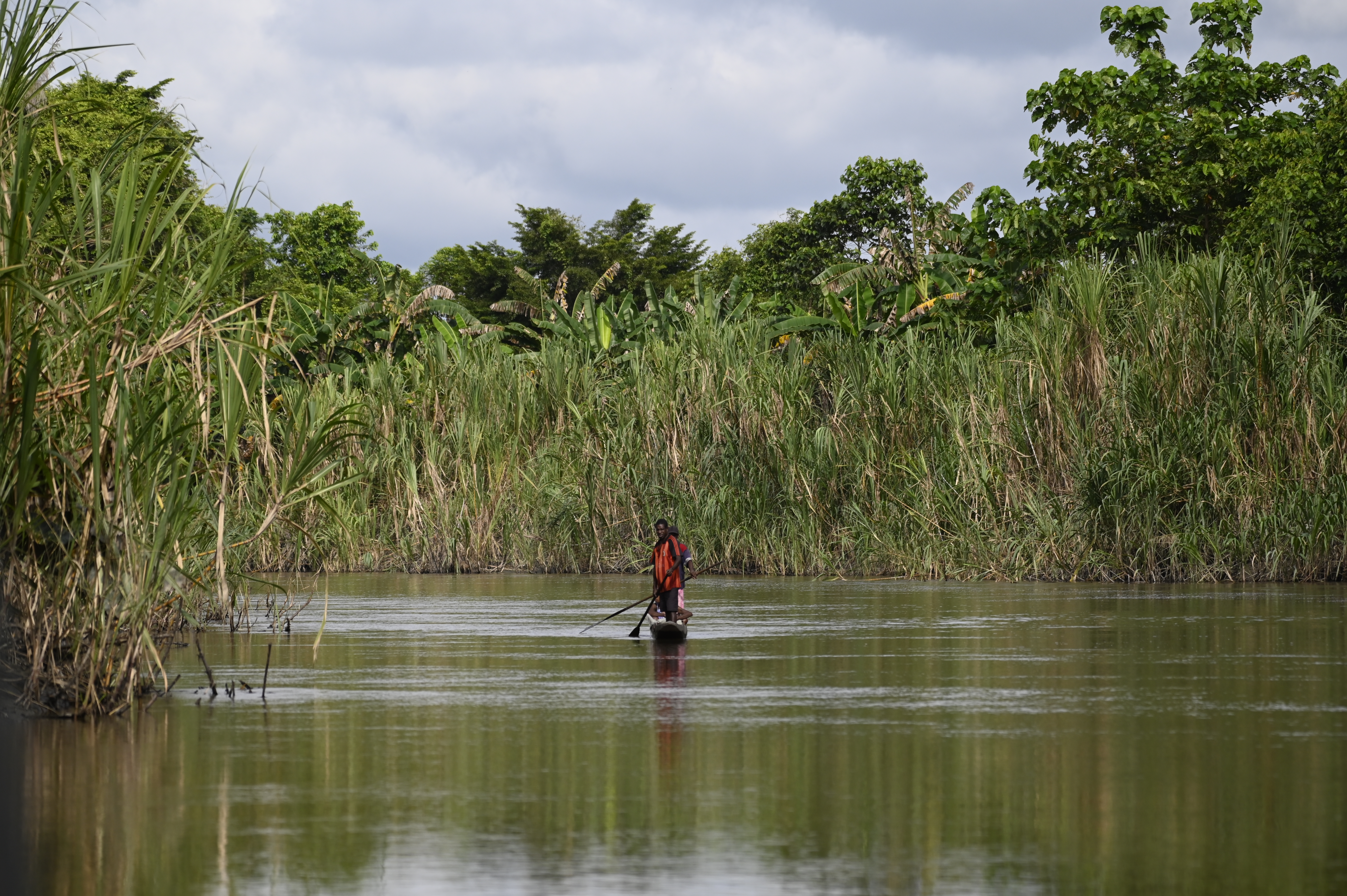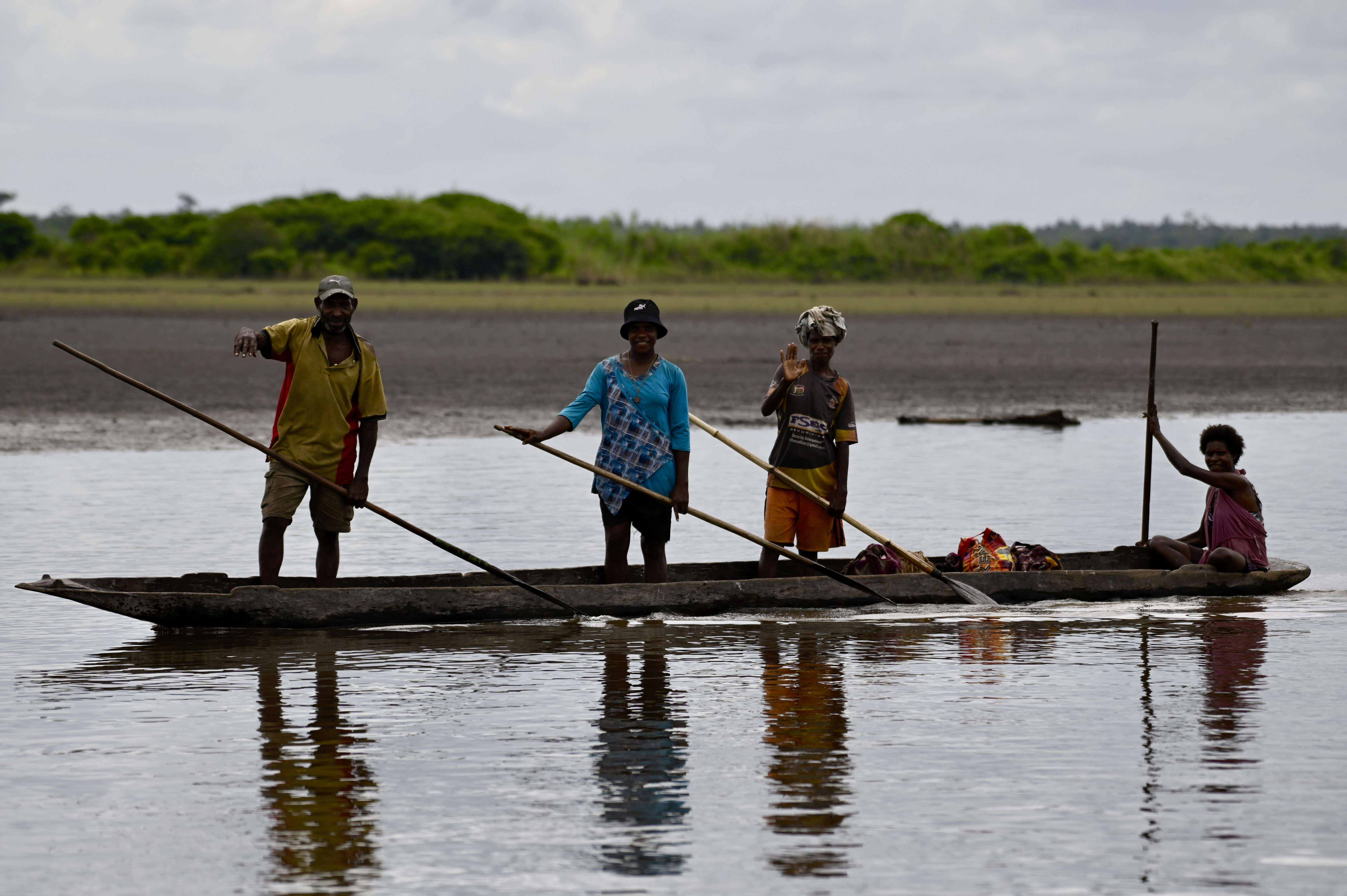 We cruised for about an hour past tall reeds, birds, the occasional village (including Joseph’s where we saw mourning shelters going up) until we reached the Blackwater Lakes Region, which we entered via a small tributary. As we entered, the water became more like wetlands – shallower and swampy – we could see the bottom at times – and the growth on the river’s edge became much lower and flatter. There were lots of people out fishing in canoes.