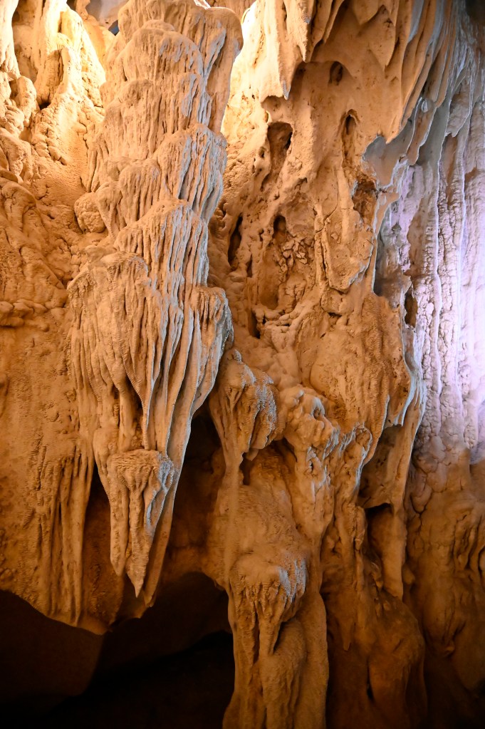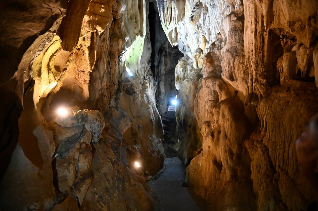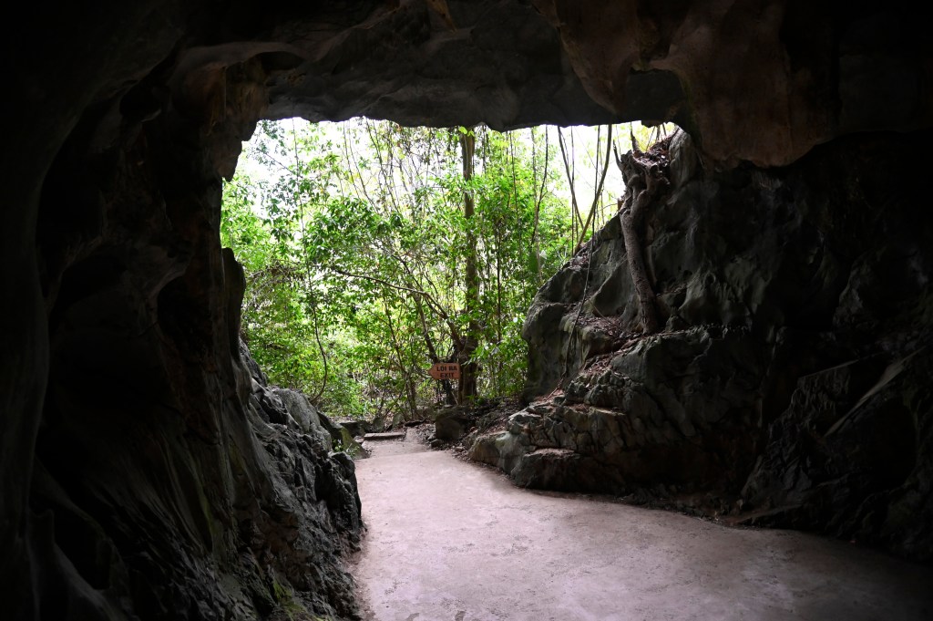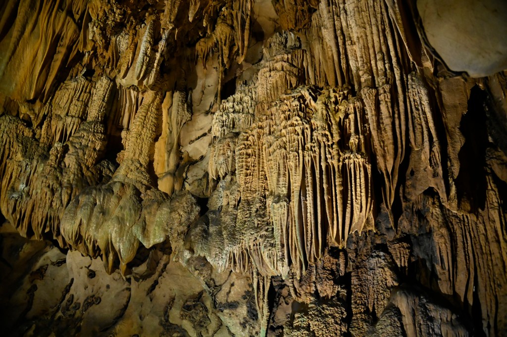We boarded and took a short cruise to a point where I could take an excursion to see the Trung Trang Cave which stretches a distance of 300 yards through one of the karsts. It’s estimated that the cave is hundreds of millions of years old, and was rediscovered in 1938; it served as a US hospital during the Vietnam War. The cave is approached by climbing 150 stairs up a karst valley, and – though the path in the cave is now paved – its walls and ceilings are covered with stalagtites, some reaching to the floor and formed over the course of many years – we were told that one millimeter growth takes 15 years. When there are hollow stalagtites, you can knock on them and hear a variety of sounds. Some ferns grow along the path, and you can see the water cistern that was used during the War. The ceiling in some cases reached up to 20’ or 30’ feet high, but I also needed to duck at certain places along the path to avoid banging my head.