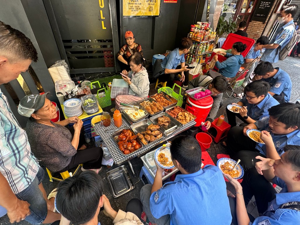 We had a bit of a break, some I walked with some friends to a local chocolate shop, started by a couple of French guys a number of years ago who wanted to exclusively use Vietnamese-grown cacao beans. I learned about the shop in the Saigon episode of “Somebody Feed Phil,” and, as one of the founders said, all they had to do was learn how to make chocolate. At the location we went to, they roast and grind the beans, then make a wide-variety of stuff – hot chocolate, ice cream, chocolate bars, chocolate candies, cakes, and bars. I opted for the chocolate milkshake with broken cookies. Wicked good. Chocolate rush. Sugar crash. The walk back to the hotel gave us a chance to see street-life around 11:30 a.m., with a number of school-going teenagers out for lunch at street-side restaurants and coffee shops.