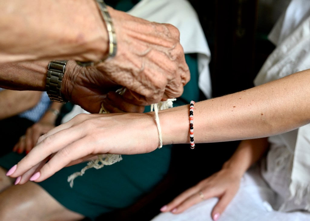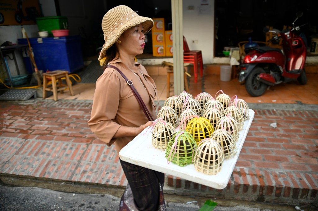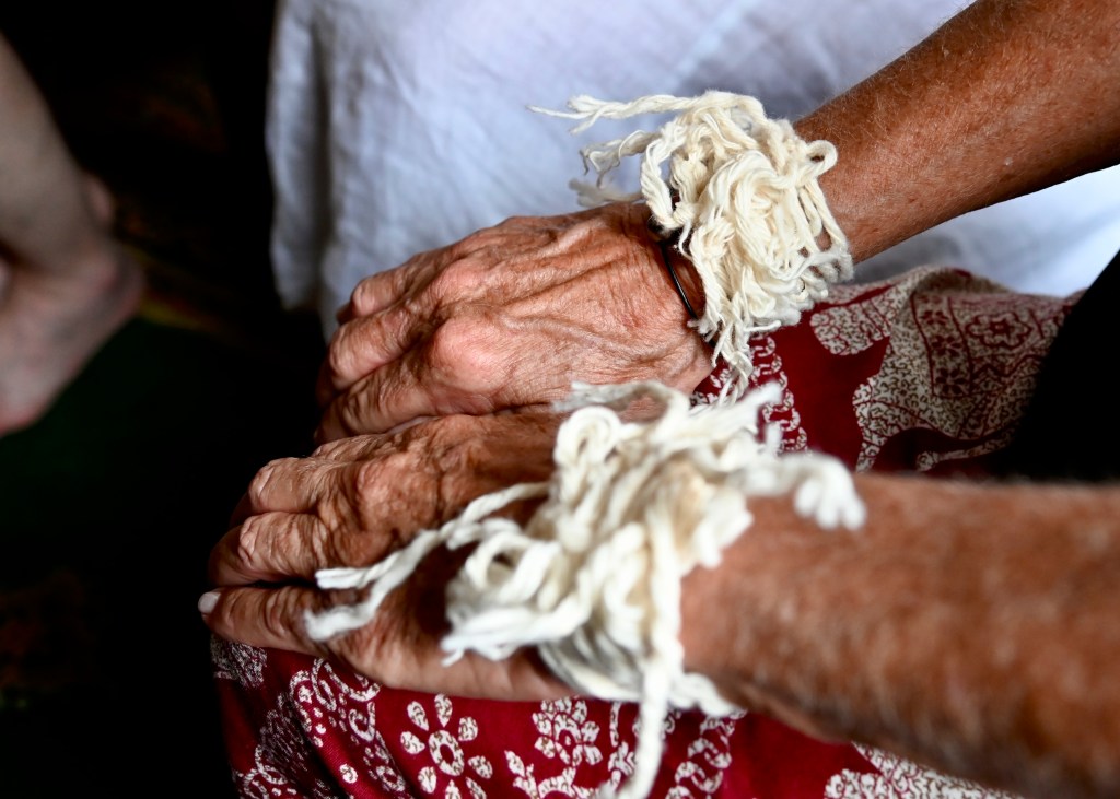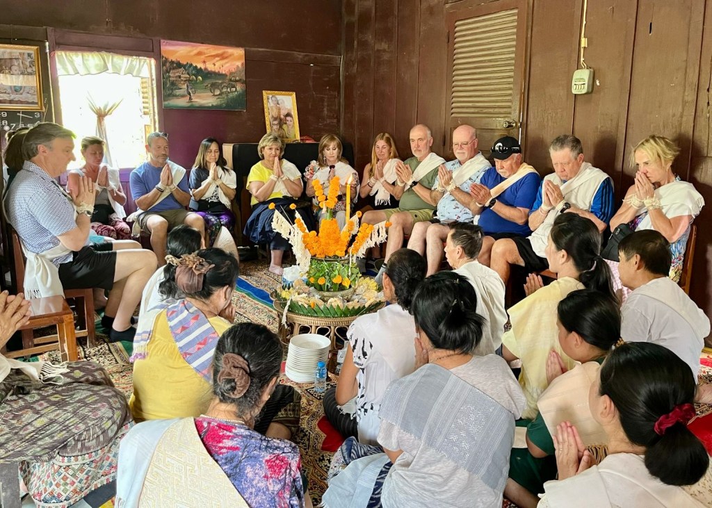 From there, we were off to our next morning treat, participation in a “baci” ceremony, a traditional Lao peoples ritual to celebrate important events and to provide blessings. We gathered at the home of local couple, who had been joined by eight of their neighbors and a shaman. The shaman led off the ceremony with some prayers, and then each of the ten individuals tied a small length of plain white cotton cord around both of our wrists, so 10 on each wrist, 20 in all. We ended the ceremony by sharing bananas, rice cakes, and shots of “lau lau” – homemade rice wine, that burned as it went down. We were to leave the cotton on our wrists for a minimum of three days, after which they could be removed (by being untied, not cutting them off).