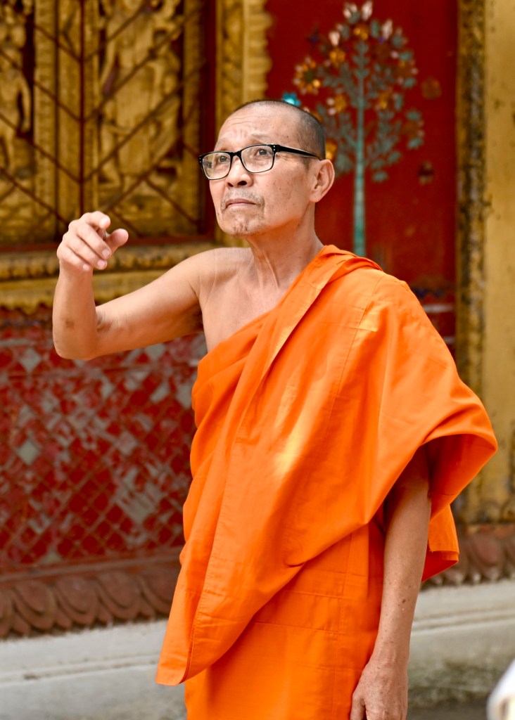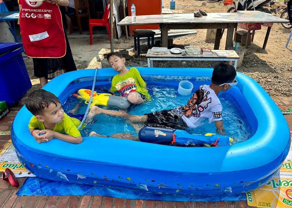 We arrived during the three-day Lao New Year celebration, and our guide alerted us to blocked streets and that one way the locals celebrate is to douse people with water – from water pistols, water rifles, hoses, and buckets, no matter whether you are walking by or driving by – in a tuk-tuk, on a motor-bike, or in a car; there even were pick-up trucks loaded with people in the back who doused people at roadside in return. It represents a form of purification for the new year, and, yup indeed, we got purified.