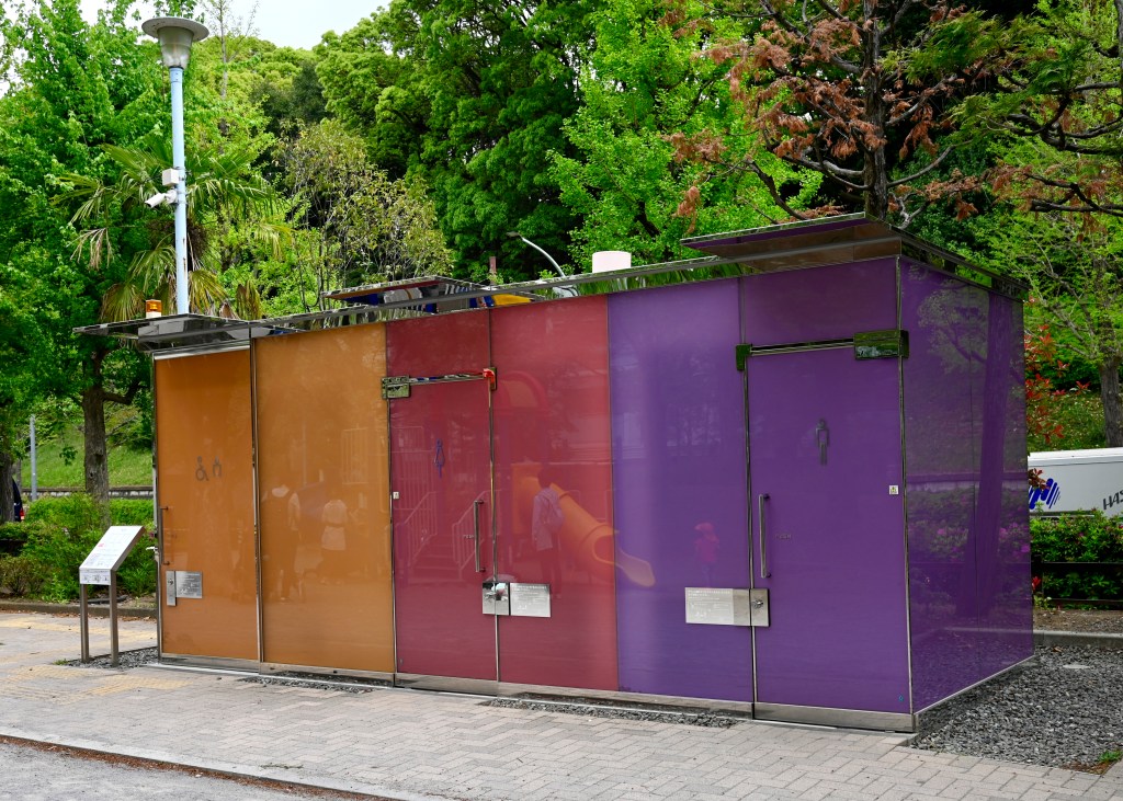 But the toilets he cleans aren’t just any toilets – they are some of the 17 “Tokyo Toilets,” each beautifully designed by artists and architects. One for example, is characterized as a “toilet village,” huts designed to fit into the lush public park where it stands. Another has exterior colored glass that is transparent until the door is locked in each toilet, when the glass turns opaque.