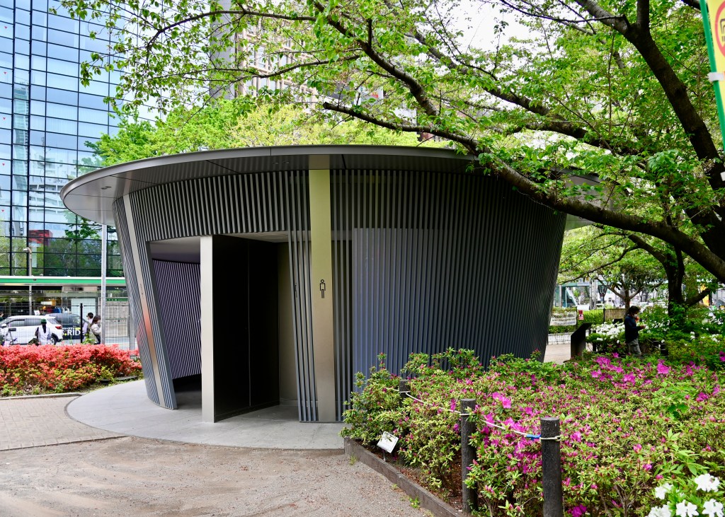 So – for the next part of my day, I took a cab to the neighborhood of Shibuya to visit three of the toilets, including the two I mention above. At the park where the first one is that I mentioned, located in a fancy neighborhood, I caught sight of – from a distance – a young woman and two young filmmakers filming some type of adult-oriented ad, the model pulling her skirt up and lowering her top. The second two toilets (one of which I used) were located in small pockets of calm among busy, busy urban areas of shopping, large buildings, and interior malls, and even a Tower Records store (maybe they didn’t get the memo?). The neighborhoods felt to me like commercial districts in Brooklyn. Lots of locals and lots of tourists.