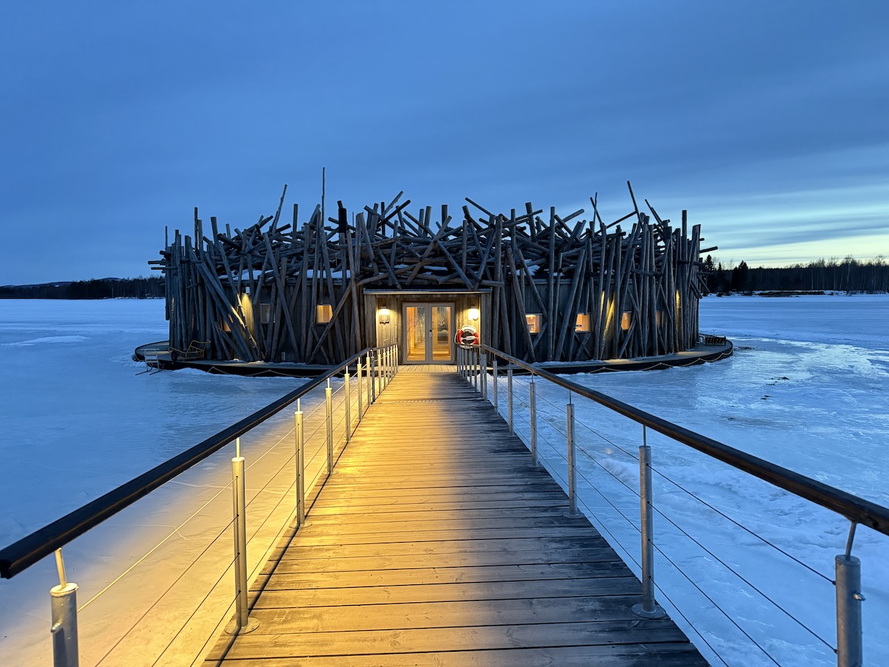 Our hotel for the next two nights was the beautiful Arctic Bath Hotel which sits on the edge of – and some buildings literally atop – the Lule River. The main building (the picture at the top of this post; reception, dining room, bar, sauna) – circular and covered with what look like tree trunks (honoring the Swedish timber tradition) – sits floating on the river in the warm weather and atop the river ice during the cold months. Two sets of rooms – each individual cabins – exist; some, like the main building, sit on the river; others are on the land by the river’s edge, surrounded by frost- and snow-covered trees. I had one of those rooms, which belongs among the most beautiful places I’ve ever stayed.